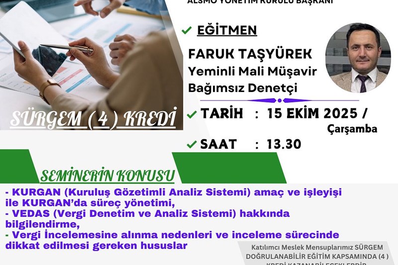 Sektörde eğitim ve sektörle iş birliği protokolü kapsamında; meslek mensupları ve meslek stajyerlerine yönelik seminerde Yeminli Mali Müşavir Faruk TAŞYÜREK tarafından kapsamlı bir eğitim verildi. Seminerde;