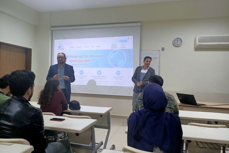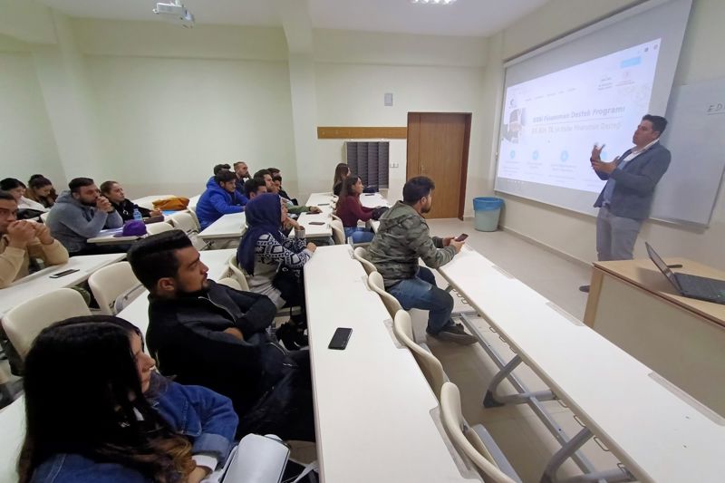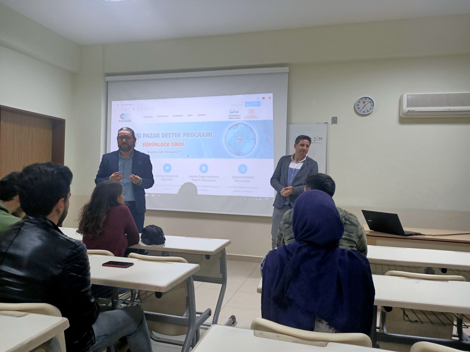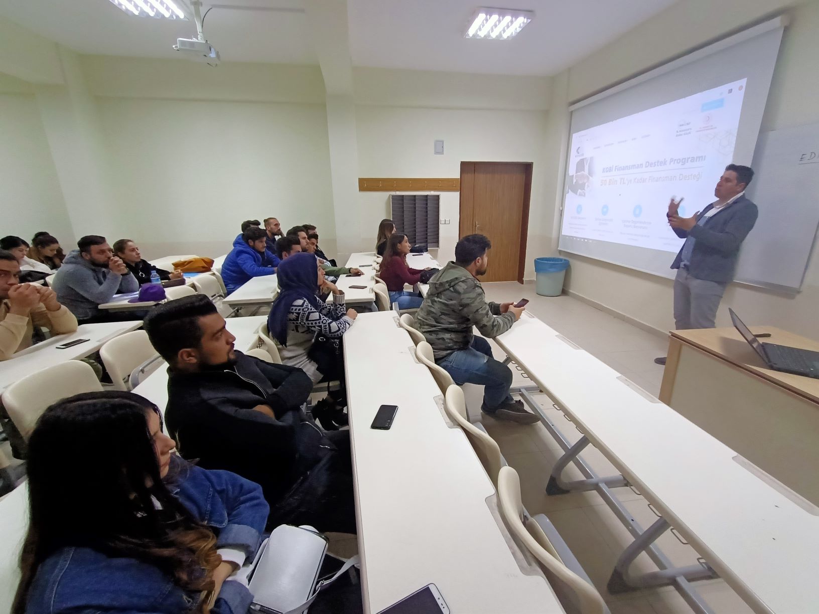 Kosgeb’in girişimcilik destekleri, iş planı hazırlanması ve sunumu, mevcut işletmelerin geliştirilmesi ve Kosgeb desteklerinde öne çıkan sektörler hakkında bilgi veren ŞAHİN, iş fikirlerinin projeye dönüşerek gerçekleşmesinde Kosgeb’in önemini vurguladı. Dr. Öğr. Üyesi Davut KARAMAN güçlü ekonominin temeli olan yerli üretim için girişimciliğin geliştirilmesi ve uygulamaların artması gerektiğini ifade ederek, katılımlarından dolayı sayın Ali ŞAHİN teşekkürlerini takdim etti.