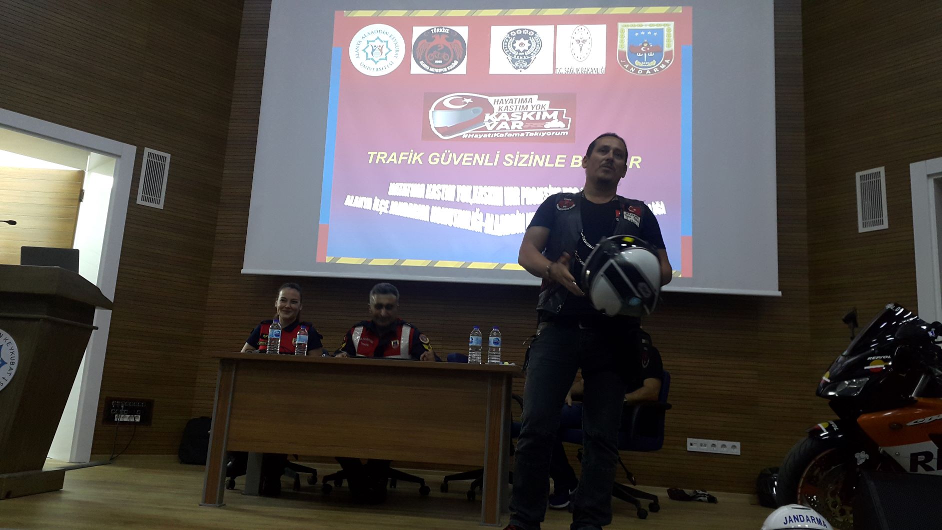 Saygı duruşu ve İstiklal Marşı’nın ardından ev sahibi olarak konferansın açılış konuşmasını ALTSO MYO Müdürü Dr. Öğretim Üyesi Mürsel Ozan İNCETAŞ yapmıştır. Açılış konuşmasının ardından sunumlarına, Alanya İlçe Jandarma Komutanlığı 43. Jandarma trafik Tim Komutanı Jandarma Astsubay Üst Çavuş Sinan ÇINKIR, 2. Jandarma Motosikletli Trafik Tim Komutanı Jandarma Astsubay Üst Çavuş Eda ÇEKMEZ devam etmiştir. Trafik, trafik kuralları, trafik kurallarına uymanın önemi ve iki tekerlekli taşıtlarda kask kullanımının önemine dikkat çekilmiştir. Alanya Moto Spor Kulübü Başkanı, Uğur UZUN iki tekerlekli kask ve koruyucu ekipmanlarının kullanımı konusunda interaktif ve uygulamalı sunumunu gerçekleştirmiştir. Sayın Uğur UZUN’a uygulamalı anlatımları esnasında, Alanya İlçe Jandarma Komutanlığı 1. Jandarma Motosikletli Trafik Tim Komutanı Yardımcısı Uzman Jandarma Altıncı Kademeli Çavuş Hakan BAŞOĞLU, 1. Jandarma Motosikletli Trafik Tim Elemanı Jandarma Uzman Çavuş Deniz YILDIRAN yardımcı olmuştur.