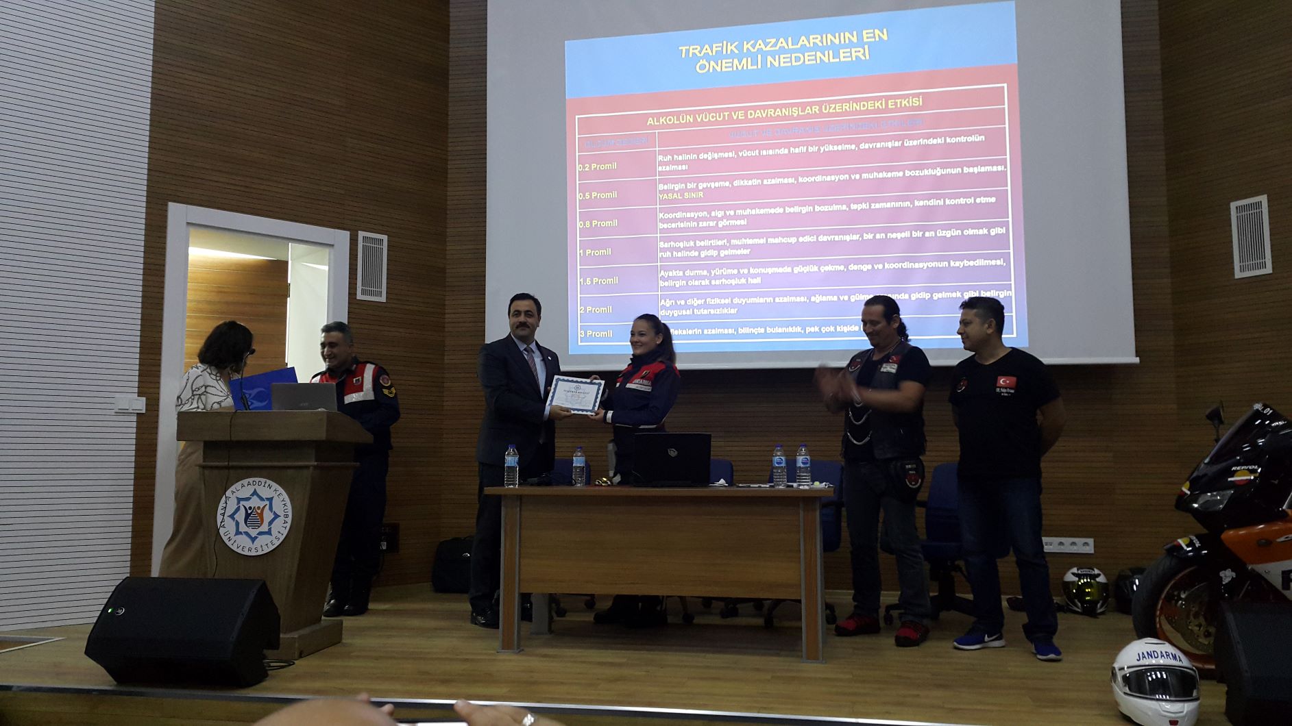 Son olarak 112 Doktoru Hakan ARITANAR, Trafik kazalarında yapılması gerekenler ve ilk yardım konusunda pratik ve uygulamalı bilgiler vermiştir. Sayın Hakan ARITANAR’a uygulamalı anlatımları esnasında, 1. Jandarma Motosikletli Asayiş Tim Elemanı Jandarma Uzman Çavuş Emre SAT yardımcı olmuştur.